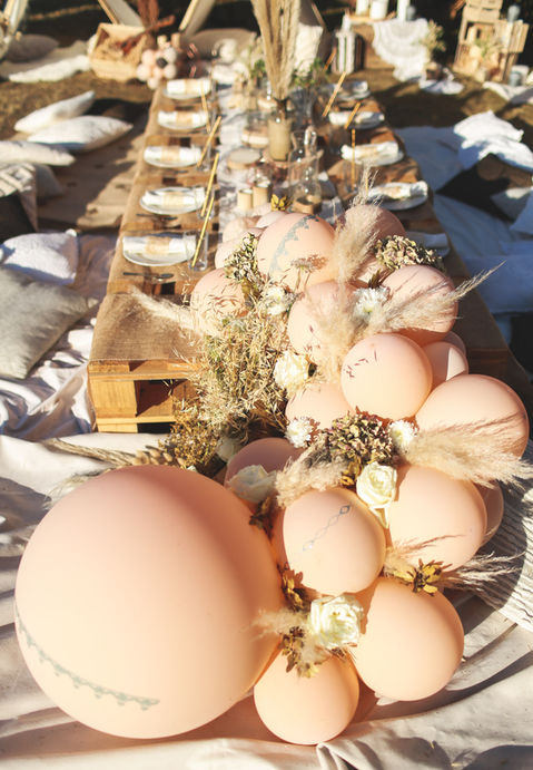 Nous créons des décors personnalisés avec une base de ballons à laquelle nous apportons diverses matières selon votre thème, lieu, budget.
